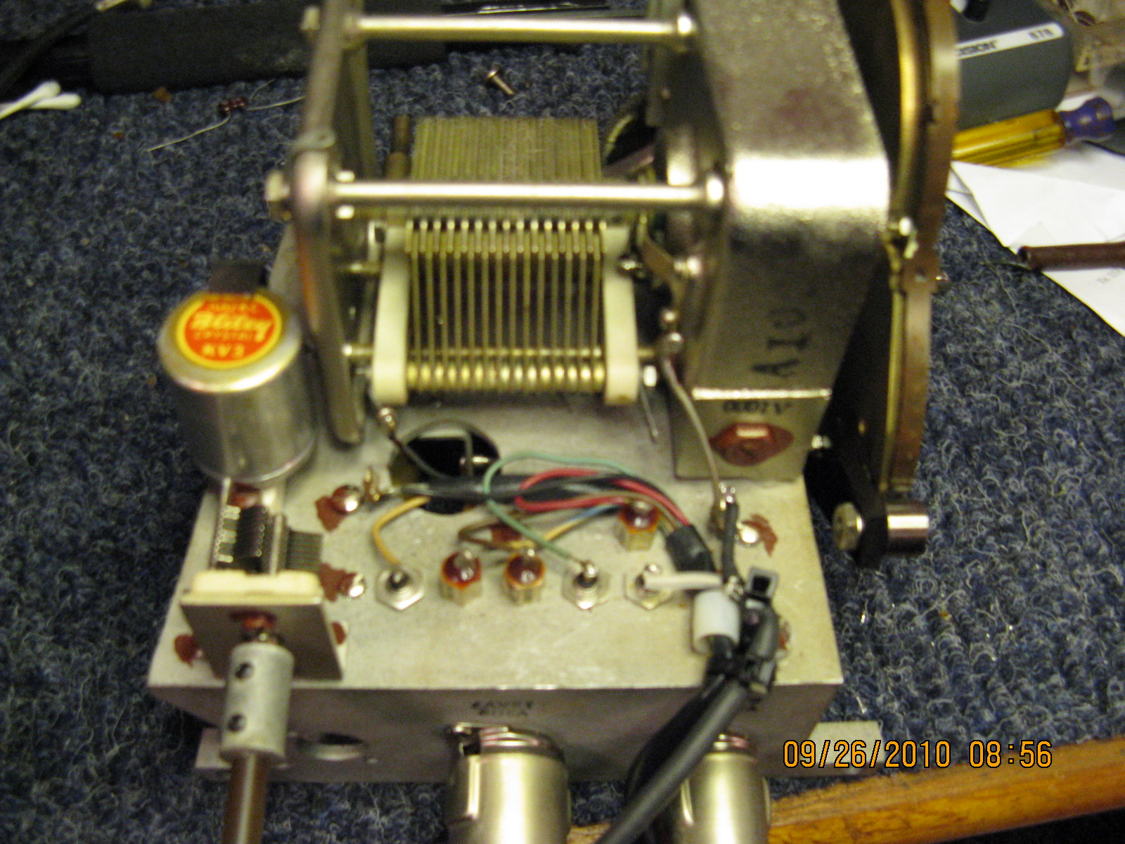 Important NOTE:  When satisfied that the M.O. is working properly be sure that the Cardwell capacitor is fully meshed. Use the straight edge of a ruler to ensure this. Now, carefully reinstall the cast aluminum case (containing the M.O.) by replacing the four screws with washers, using the Vanco screw holding screwdriver. This is often a two man operation as you simultaneously must carefully align the three shafts in the flexible couplings before screwing in the four screws and washers.  Be sure that you do not over tighten these four screws as they are threaded in a fiber washer.   Reinstall the six Allen screws in the couplings, and tighten. One of the Allen screws in the shaft of the main M.O. tuning should be tightened on the flat surface of the flexible shaft of the Cardwell capacitor to prevent the shaft from turning as the main tuning knob is spun. It is important that the position of the shaft of the Cardwell main tuning capacitor was not disturbed in this process.