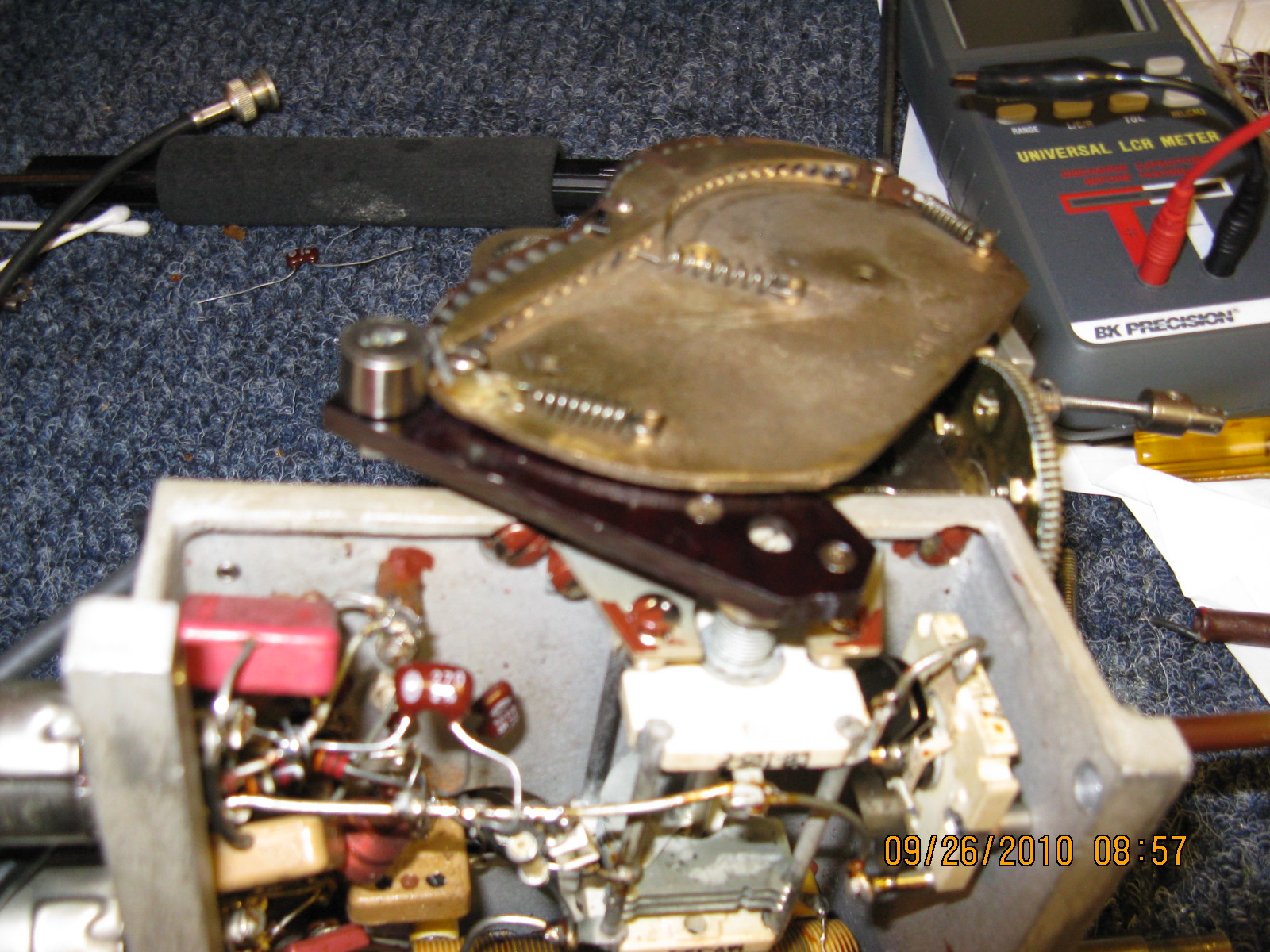 The next step is to clean, inspect and lubricate the gears, cam roller and shaft bearings. Then carefully and thoroughly clean the rotor contacts on the Cardwell capacitor with DeoxIT D5. In many cases this is the problem with the M.O.  Next, clean the rotor contacts of C-302. This is the frequency adjust capacitor that is connected to the roller that rides on the elliptical cam. Use DeoxIT D5  and clean the rotor wiper contacts thoroughly.