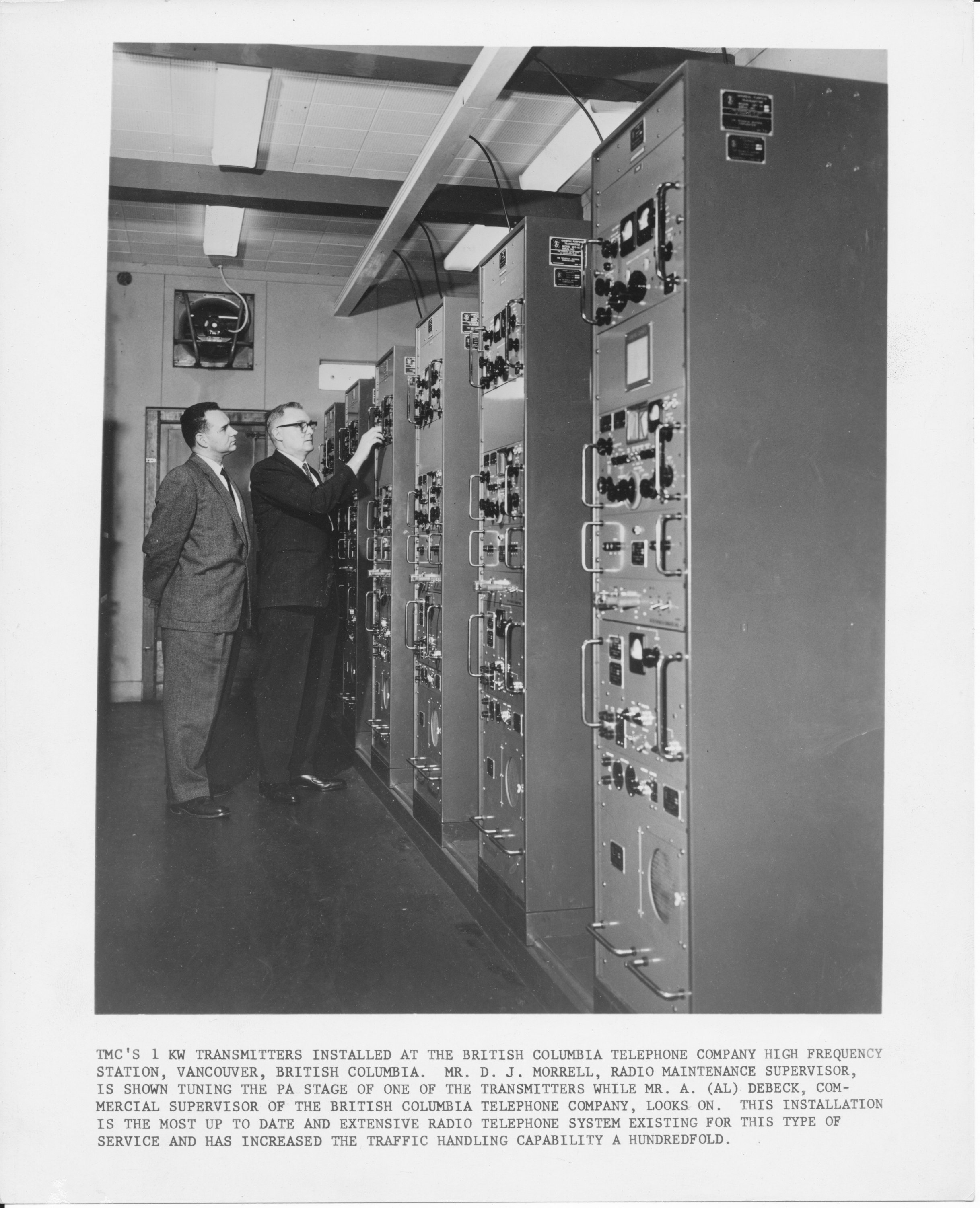 TMC's 1KW transmitters installed at the British Columbia Telephone Company high frequency station, Vancouver, British Columbia. Mr. D. J. Morrell, Radio Maintenance Supervisor, is shown tuning the PA stage of one of the transmitters while Mr. A. (Al) Debeck, Commercial Supervisor of the British Columbia Telephone Company, looks on. This installation is the most up to date and extensive radio telephone system existing for this type of service and has increased the traffic handling capability a hundredfold.