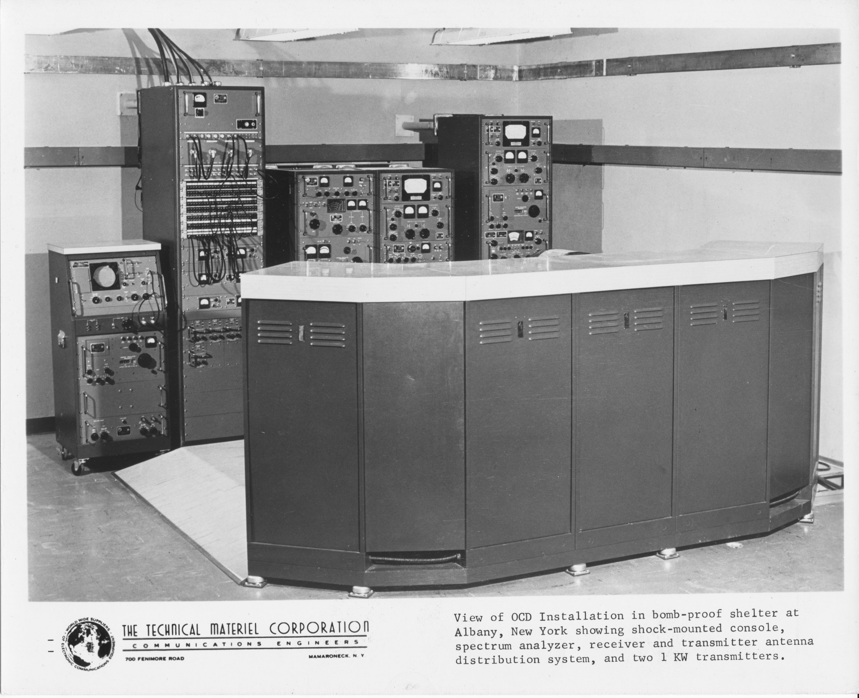 At the height of the cold war in the mid-60's, the New York Office of Civil Defense (OCD), later renamed State Emergency Management Office (SEMO), built about a half-dozen Communications Centers distributed around the state. From the beginning, TMC was chosen as the vendor for the communications equipment for the sites. Evidently discussions were proceeding between NY OCD and TMC as early as 1963, as indicated in the Letter & Project Application. It is not clear if this application became an order, but RFQ's were issued in 1964, and it appears that the stations were built and equipped over the next couple of years. They consisted a Master Control Station at Albany, and a half-dozen Auxiliary Sites scattered around the state, housed in underground bunkers that could sustain about 50-100 people for 2 weeks. These sites were clearly intended to deal with man-made disasters of the nuclear kind. Western New York was served by a site at Batavia, NY, the Hudson Valley by the Poughkeepsie site, northern New York by the Queensbury (Glen Falls) site, and the Finger Lakes district was served by a site at Newark, NY, the last of the sites to be built.