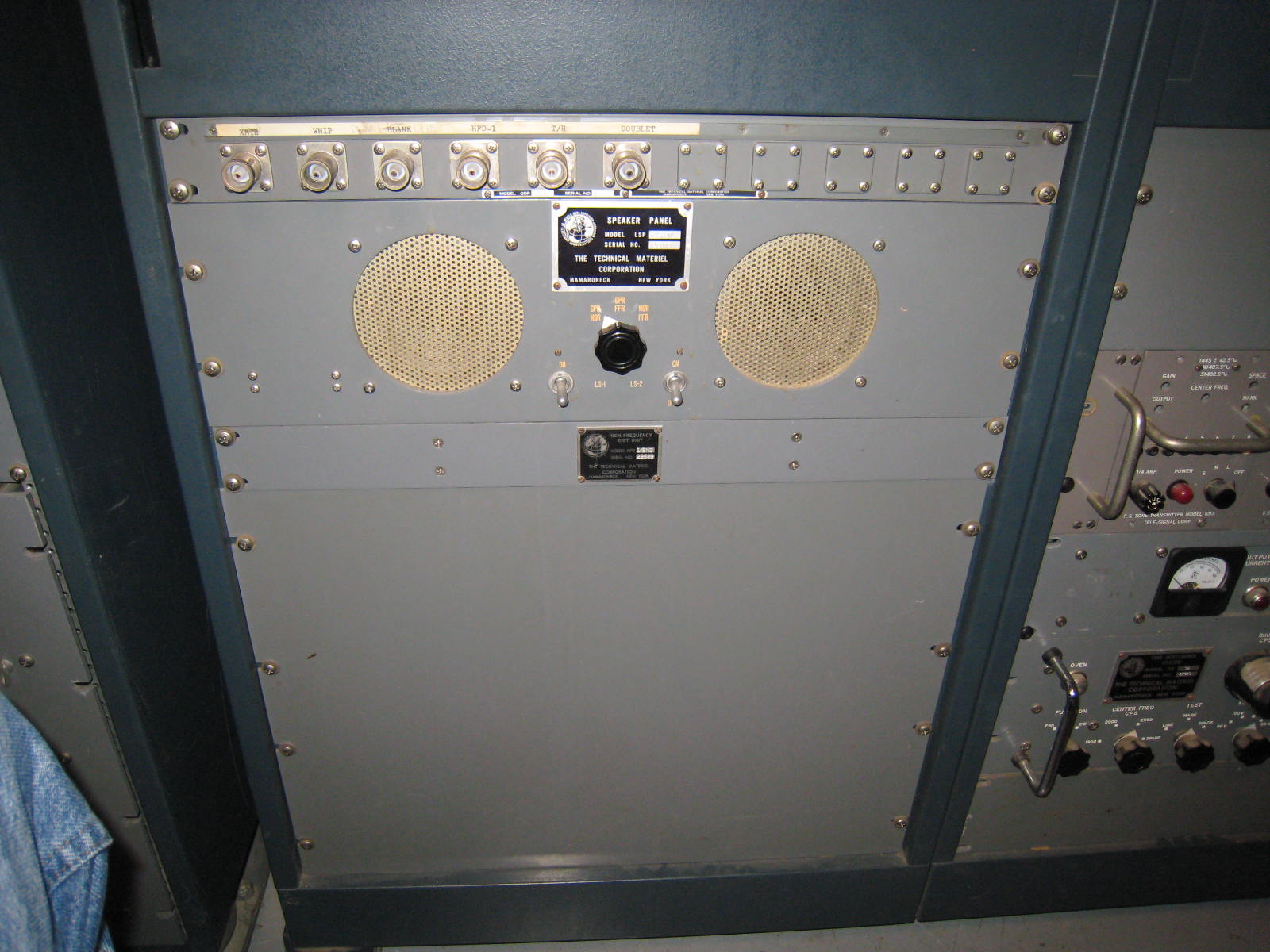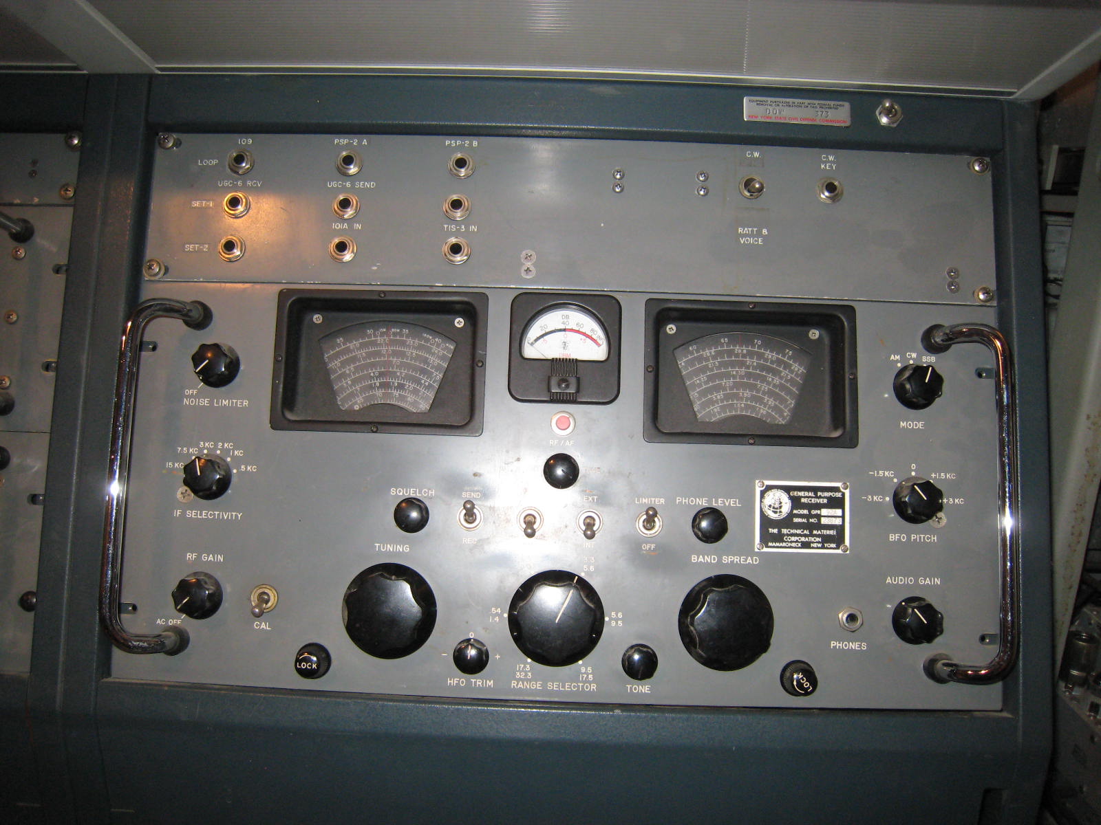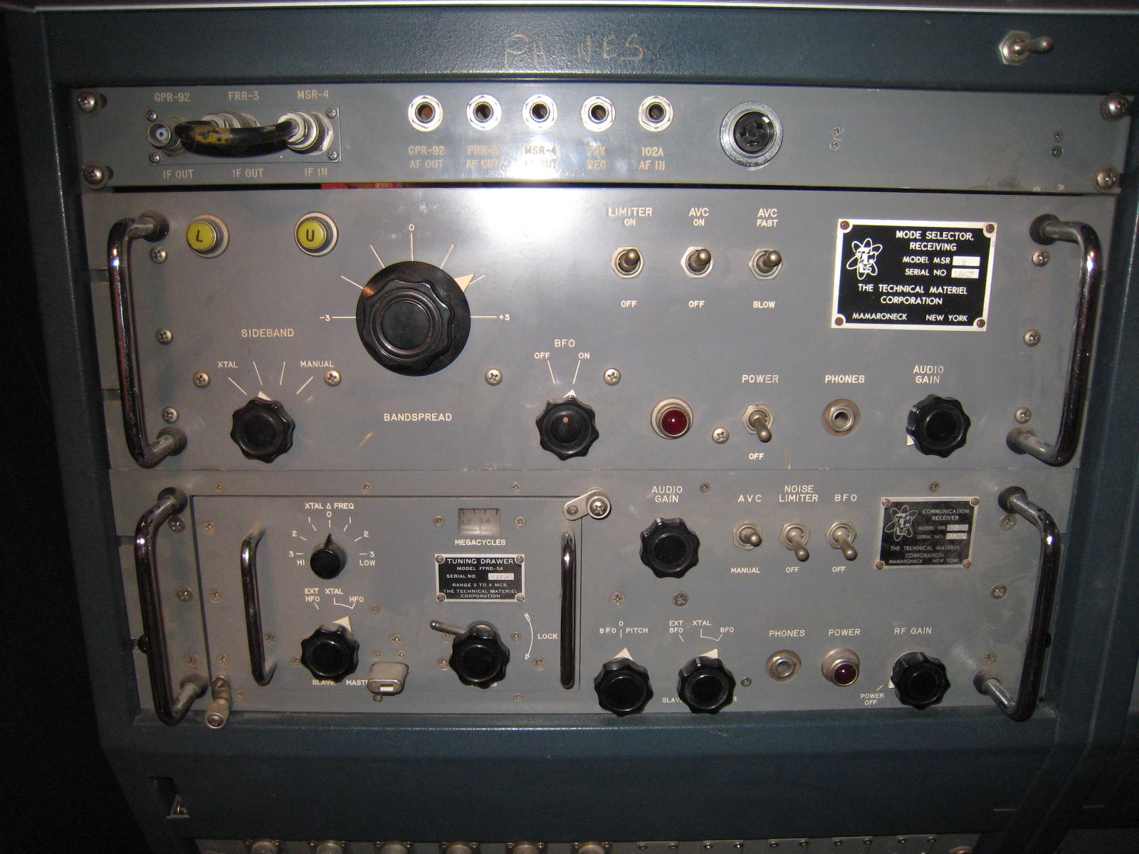 Receiving equipment consisted of an HFD antenna coupler driving an FFR and a GPR-92A (originally specified as GPR-92) receiver. Line outputs from the two receivers were routed through a custom patch panel, through an MSR-9 sideband adapter to an LSP loudspeaker. Speaker outputs from the radios were routed directly to the speaker. The audio patch panel also routed audio to the FAX receiver, and to a Tele-Signal 102A Tone Converter, through a T-S 109 Switch to a custom DC patch panel, thence to the TMC-custom-built TTY Control Unit inside the UGC-6 (KSR28) teletype machine. The HFO, IFO, and BFO for the GPR-92A could be supplied from the VOX-5.