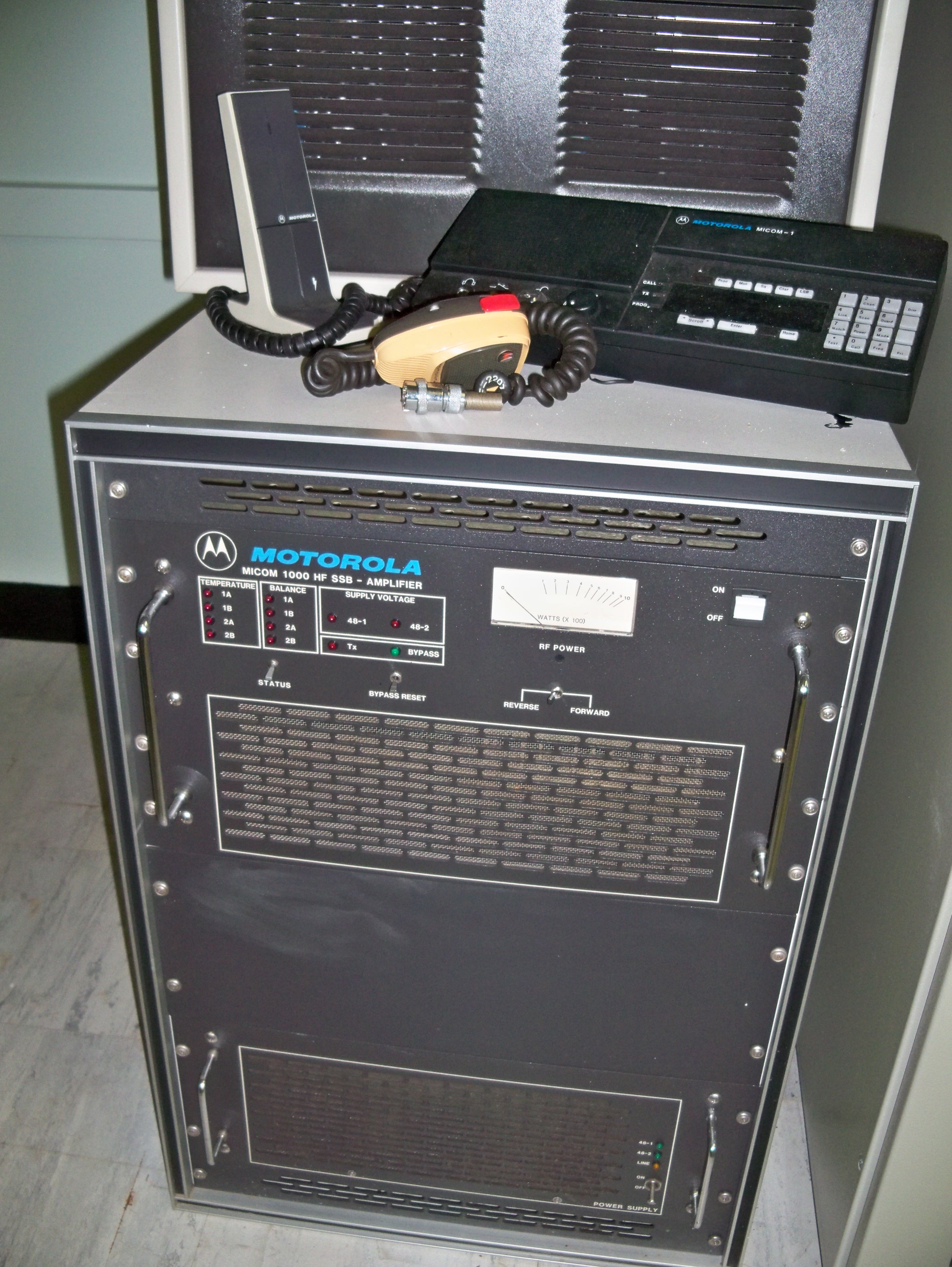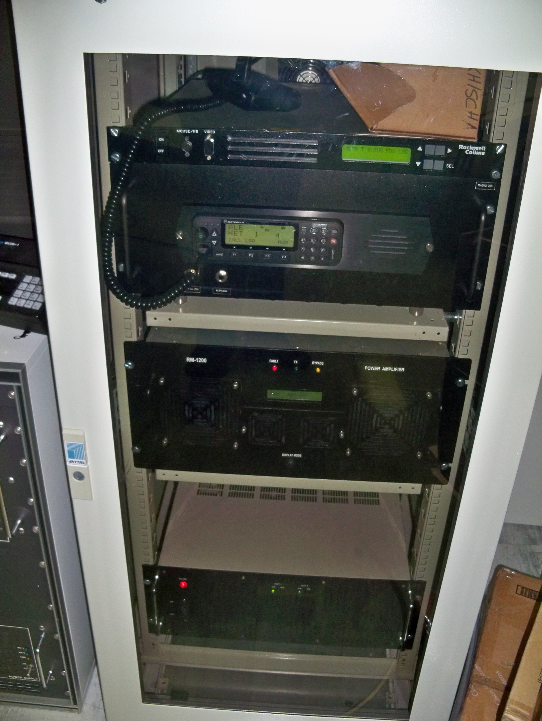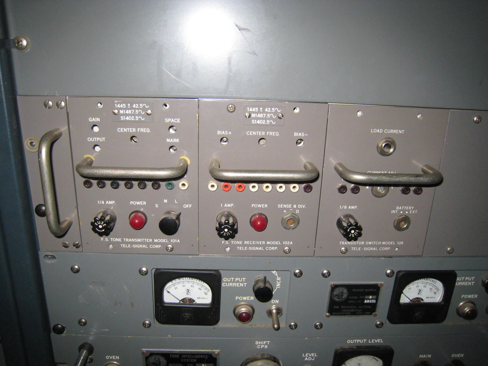 Receiving equipment consisted of an HFD antenna coupler driving an FFR and a GPR-92A (originally specified as GPR-92) receiver. Line outputs from the two receivers were routed through a custom patch panel, through an MSR-9 sideband adapter to an LSP loudspeaker. Speaker outputs from the radios were routed directly to the speaker. The audio patch panel also routed audio to the FAX receiver, and to a Tele-Signal 102A Tone Converter, through a T-S 109 Switch to a custom DC patch panel, thence to the TMC-custom-built TTY Control Unit inside the UGC-6 (KSR28) teletype machine. The HFO, IFO, and BFO for the GPR-92A could be supplied from the VOX-5.