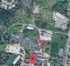 The address above is for the School for the Blind. On the image to the right, at the top center of the image, the access road curves up and stops. The entrance to the bunker is at the end of this road. No tower is visible, but I have it from reliable sources that the Batavia SEMO site was right there.. :) More on the Batavia site below. |