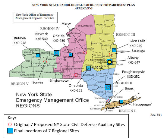 There is some confusion about the number and location of the Auxiliary-Site bunkers that were eventually built. From the TMC literature (see SYM-2007, Figure 1-1), in addition to Master Control at Albany, there were seven sites originally planned, at Saratoga, Poughkeepsie, Bronx, Binghampton, Newark, Sonyea, and Marcy. In the final build-out, Region V's site was moved to Batavia, Region IV to Oneida (East Syracuse), and Region III to Glen Falls (Queensbury). The planned station at Binghamton wasn't built, but a 3rd site in Region III at Oneonta was chosen. Oneonta was apparently selected as the backup for the Albany Headquarters site. The 7 stations, along with their callsigns and locations, are shown in the table below.