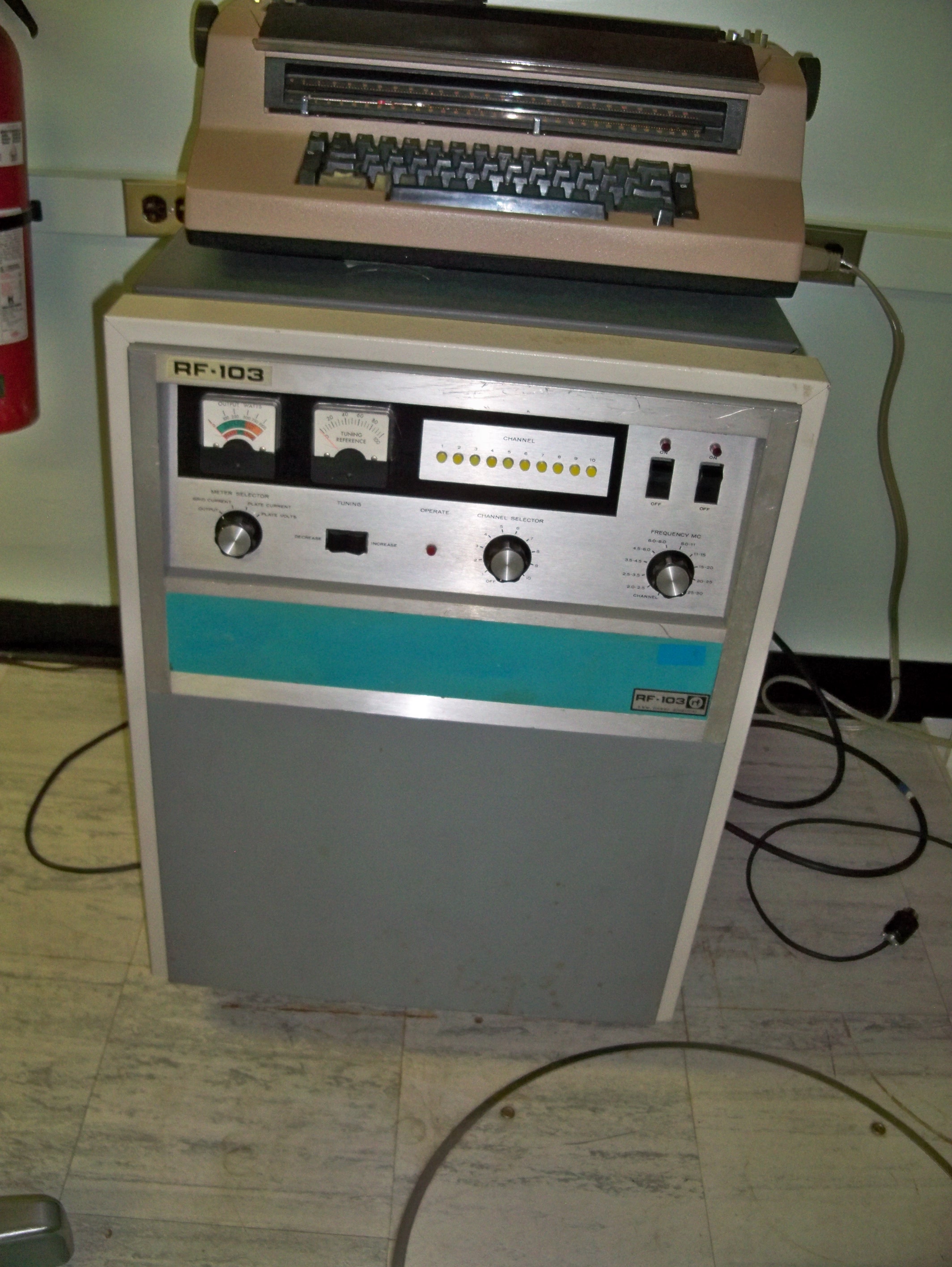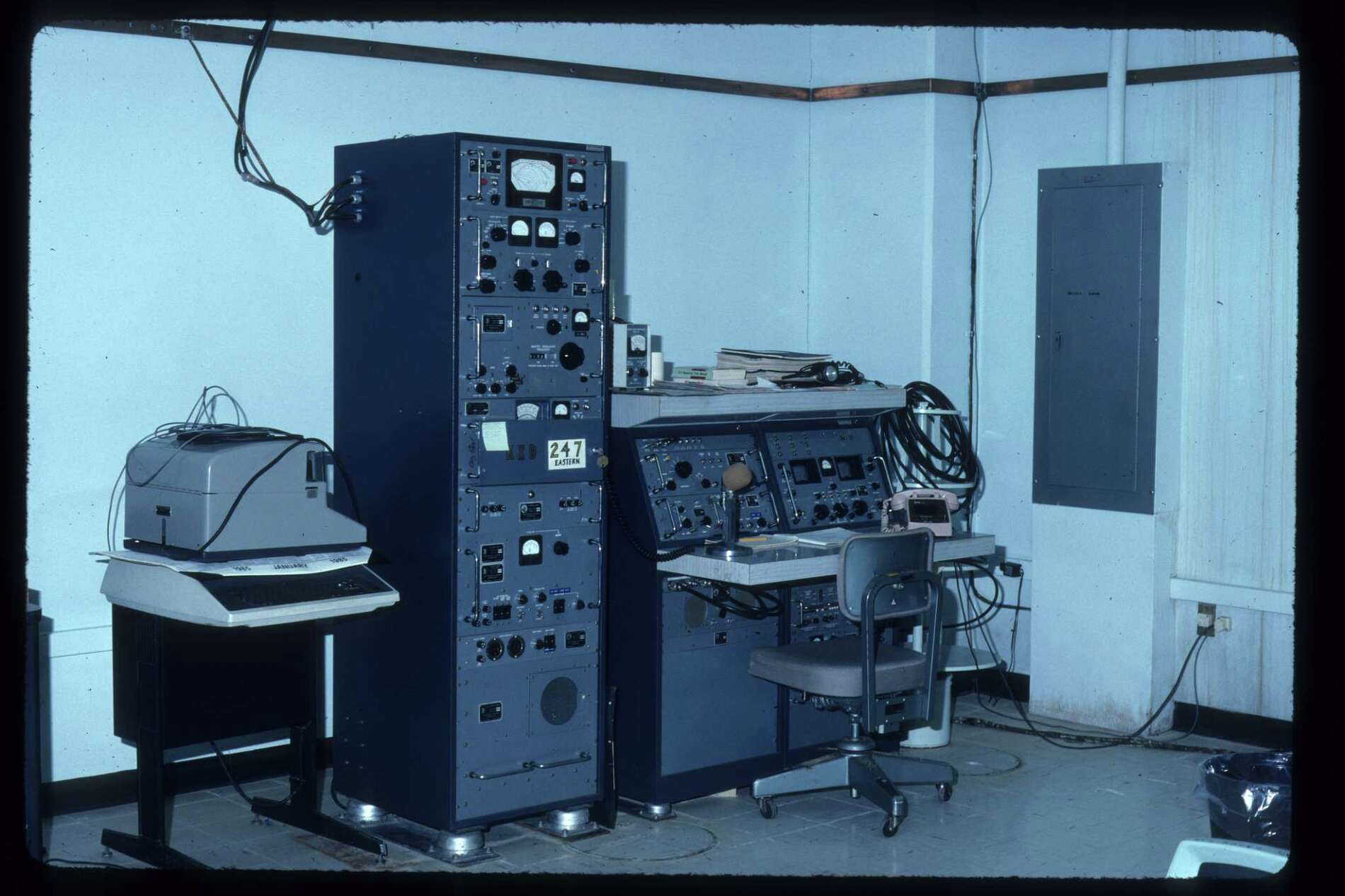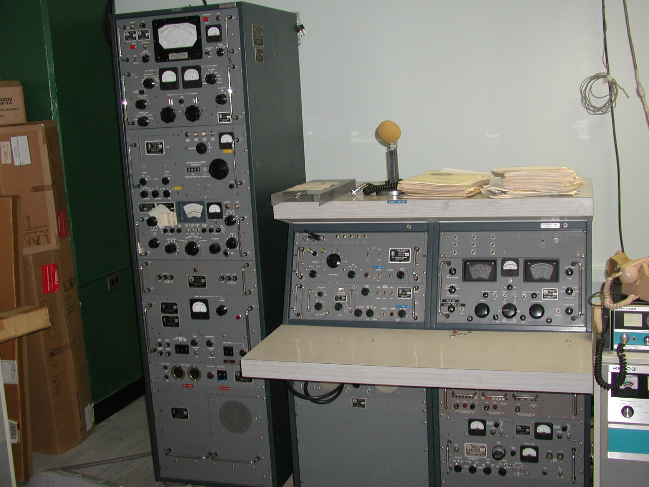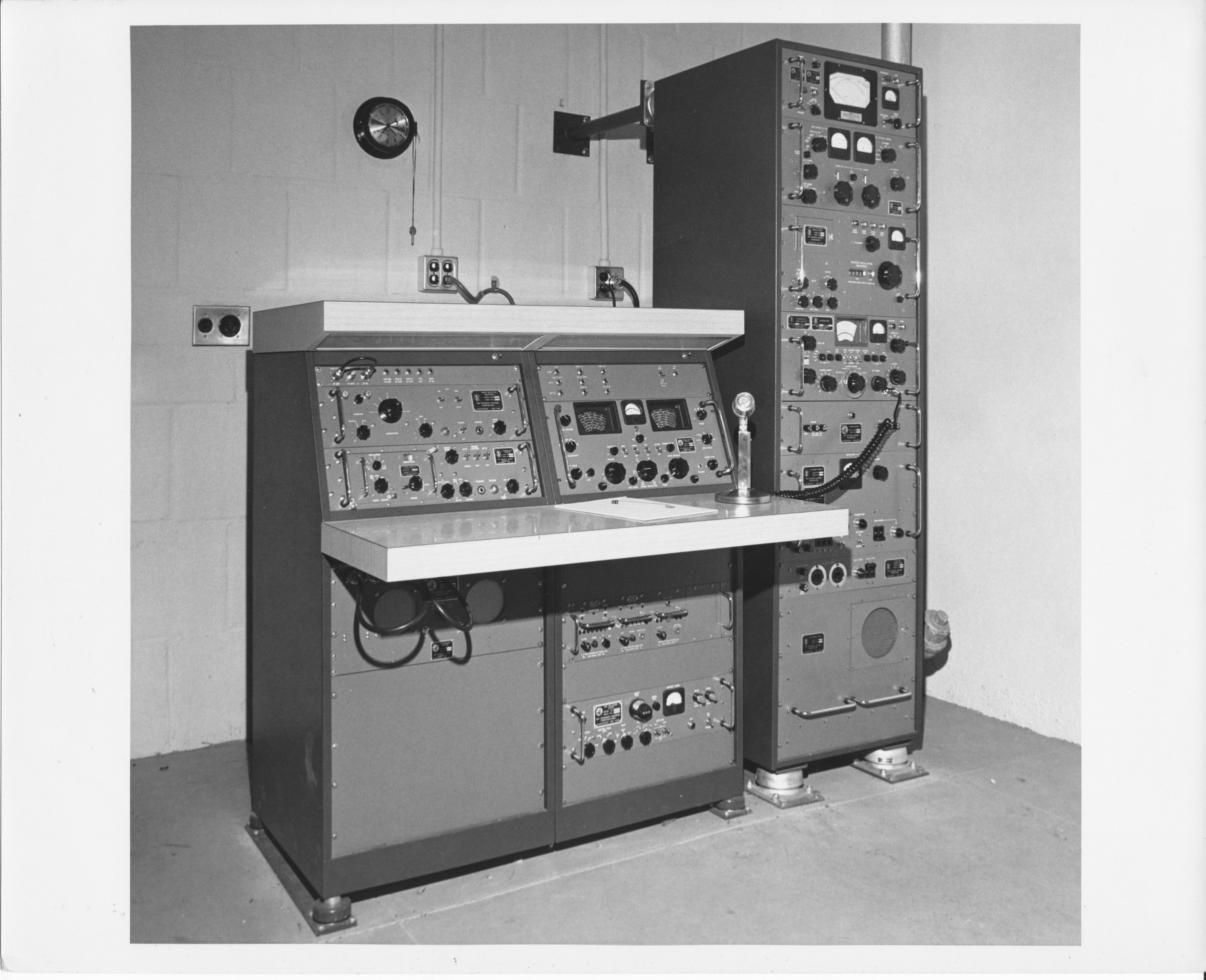 The station transmitter was an SBT-1KV, comprising a VOX-5, SBE-6, and PAL-1KA, with ATS-2 antenna control and tuning units. Operational modes included SSB speech, RTTY, FAX, and CW. The station had ISB capability, so may have operated RTTY and SSB voice simultaneously. For RTTY, the KSR28's current loop, routed through the TTY Control Unit, either directly to a TIS-3 Tone Keyer, or through a Tele-Signal 101A Keyer. For FAX operation, the FAX Scanner's DC output drove the TIS-3, which produced audio tone data for transmission. And, for CW, a key was routed through a TMC-custom-built CW Control Unit, which keyed the transmitter, and produced a side-tone that could be heard through the GPR-92A's audio system.