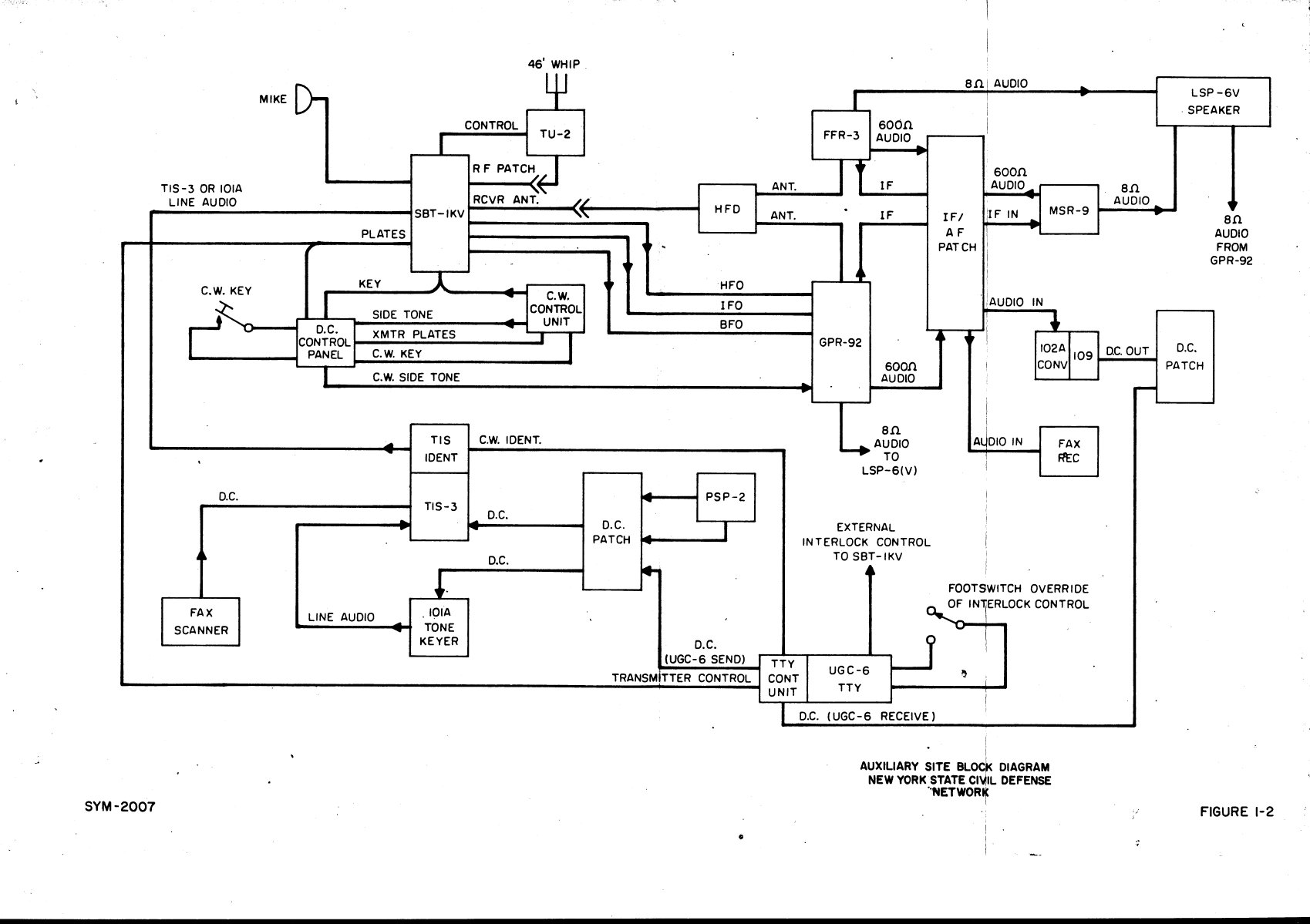 Auxiliary sites included a diesel generator set and a communications facility consisting of an SBT-1K transmitter, GPR-92A and FFR receivers, MSR sideband adapter, TTY and FAX equipment.. An illustration of a typical equipment arrangement (left) and a block diagram of the communications equipment (right) are shown below.
