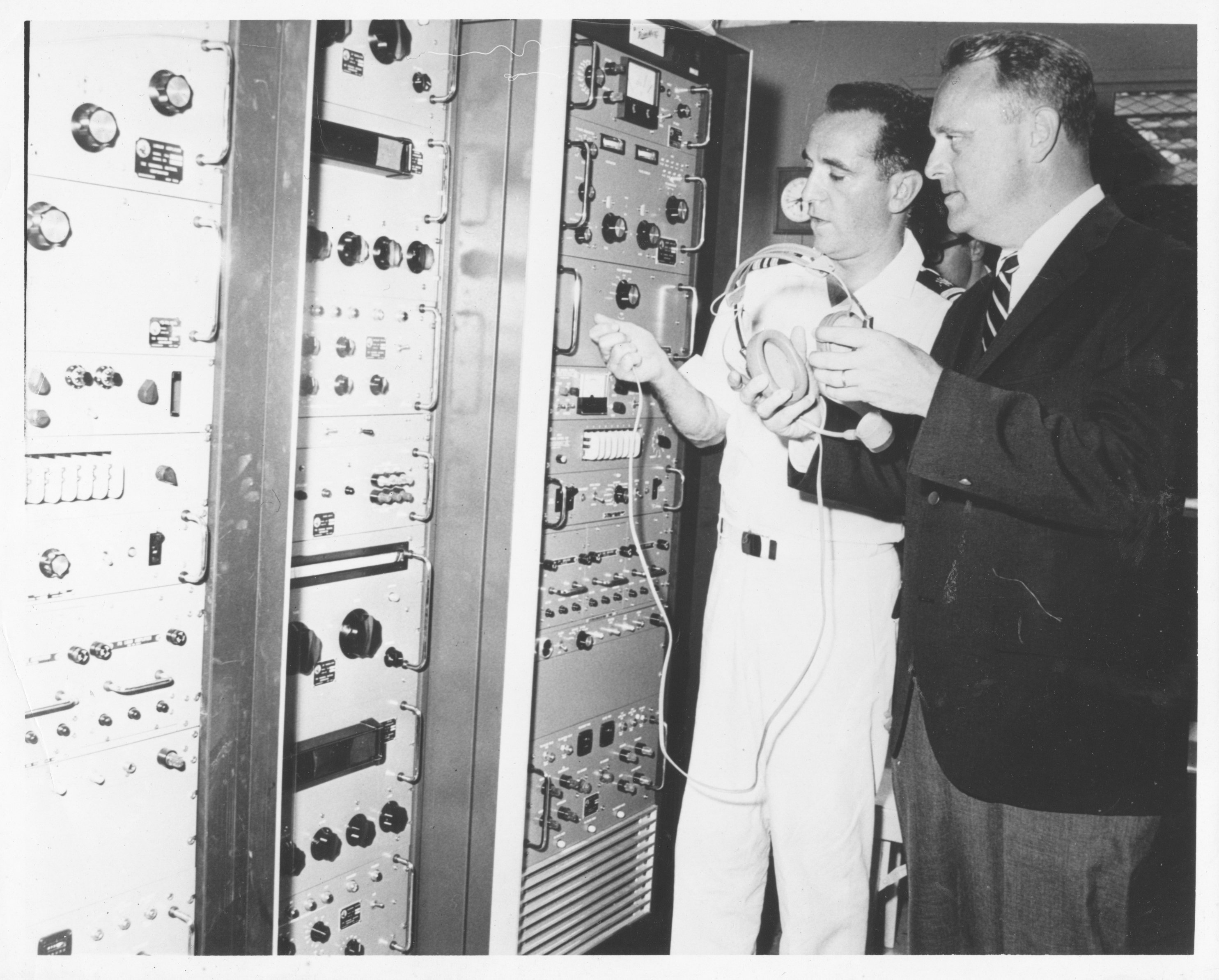 This shot shows part of a radio room aboard an unknown ship. It includes an FFR along with its "filament-warmer" friend. Back of photo says "Copy Print, MSTS Installation".