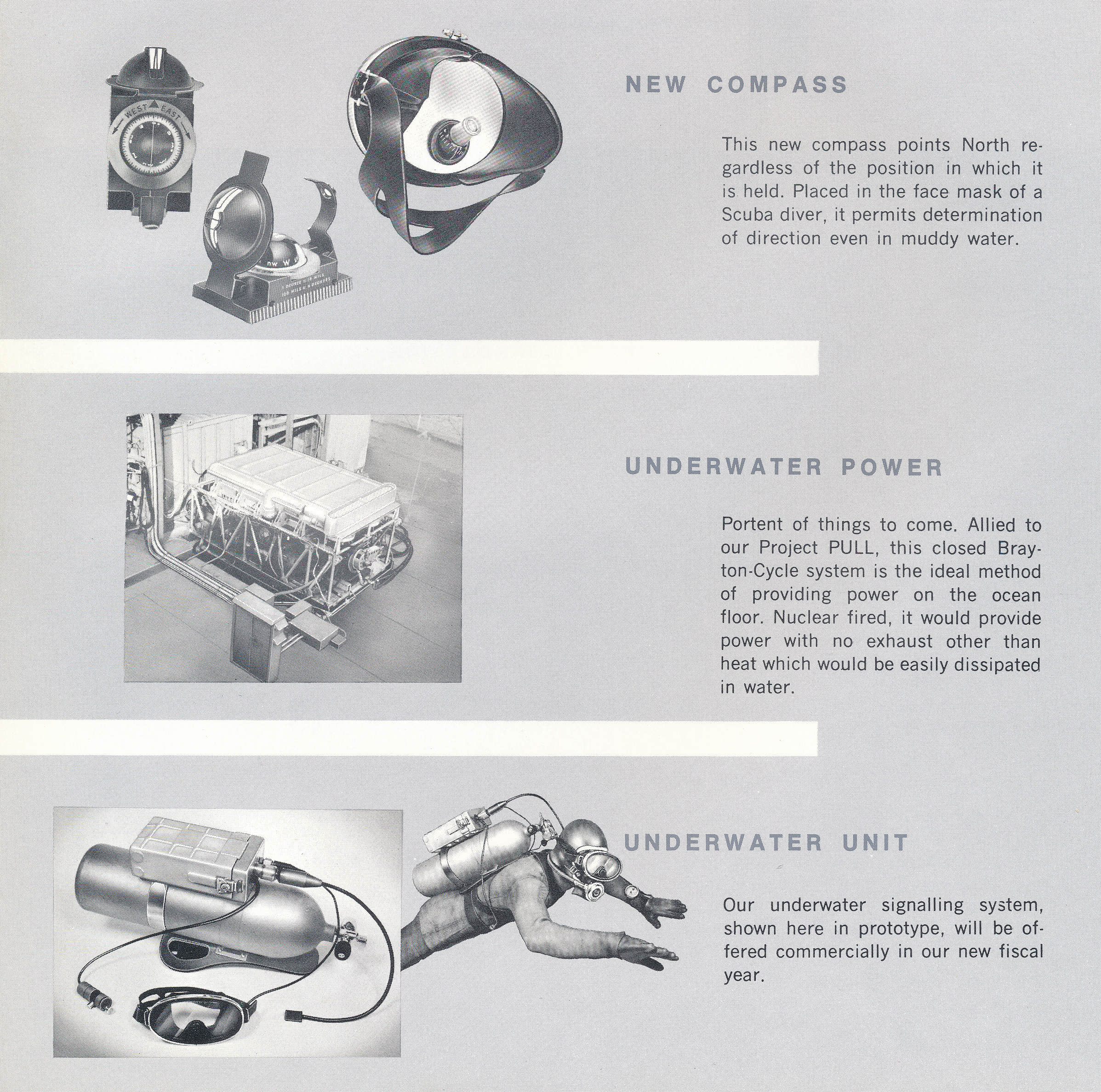The company was also working on a couple of electronic aids for divers. The first was a compass that "..points North regarless of the position in which it is held.." to be placed in the face mask of a diver. Simultaneously, work was underway on an underwater signaling system.