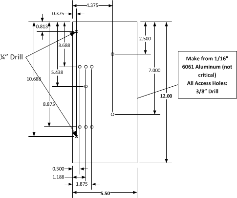 While doing the mechanical and electrical repairs on the 3 RFE-1's, and having pre-read the alignment instructions, I kept wondering.. "I can only get to the alignment trimmer capacitors from the bottom, so the bottom cover has to be off. What's going to happen to the alignment when I put the cover back on? Don't seem right..." Well, it's not right. From the discussion in S-1094, it's clear that TMC used a temporary "special cover (with holes)". So, before you even get started, you're going to have to make one of these things. After some cogitation, I realized this panel only needs to cover the area below the driver chassis. Here's a drawing for this panel: