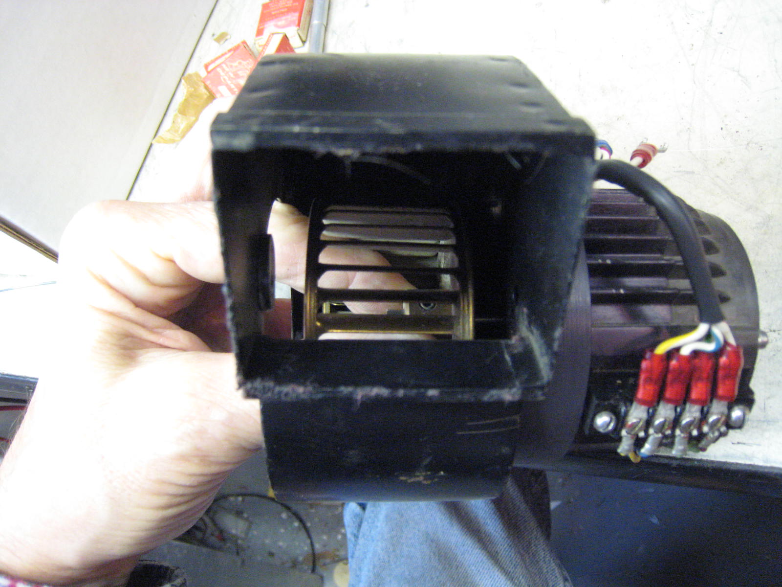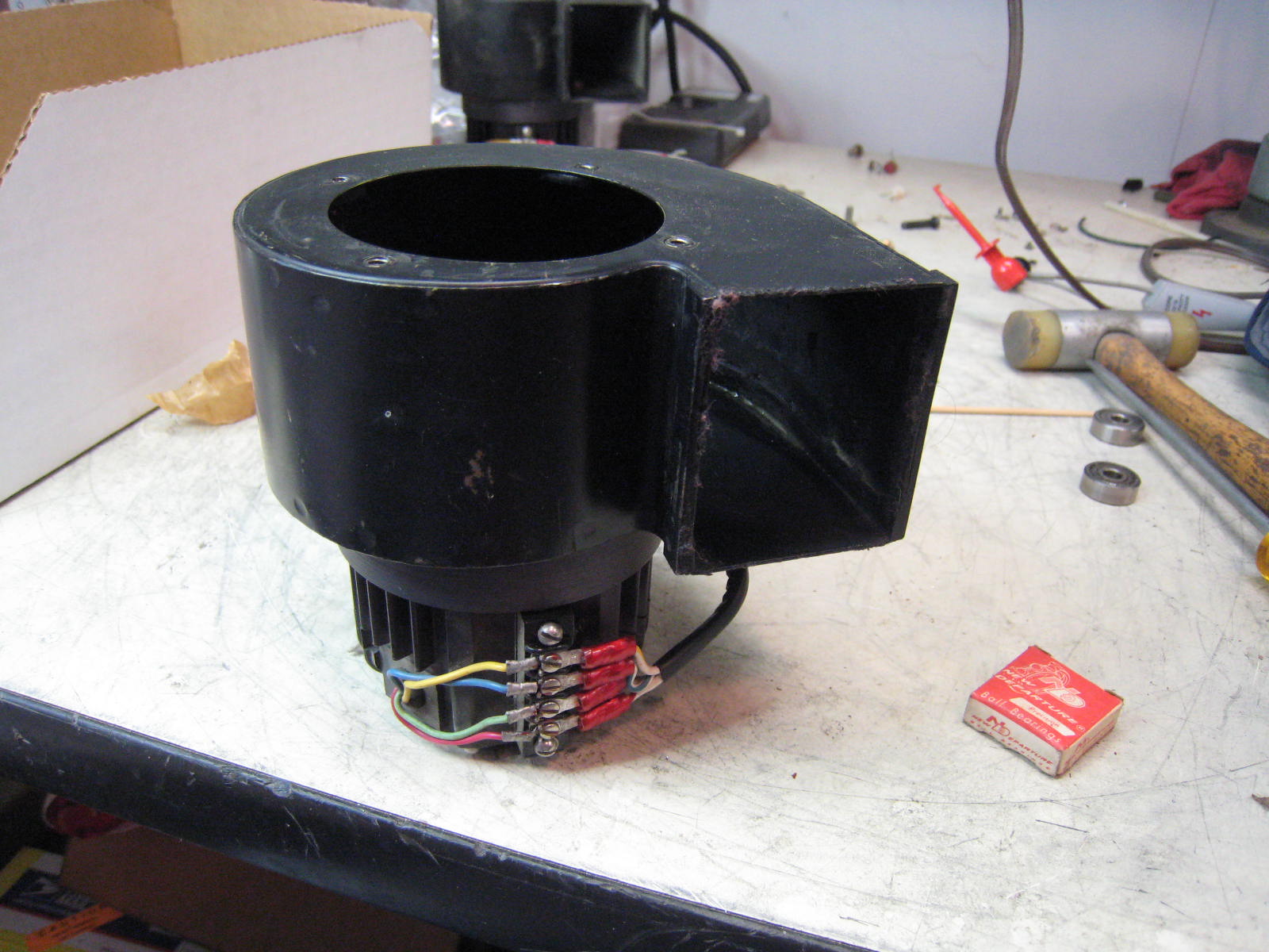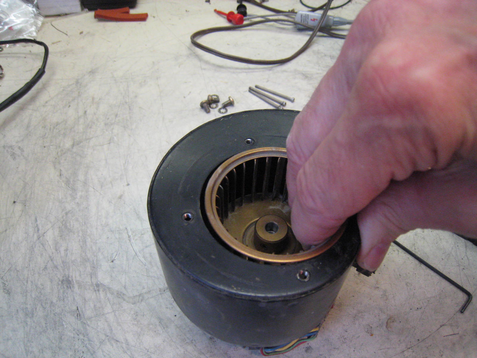 Inspection of the two amplifiers that had been in service in Canada showed that the blower rotors rotated fairly stiffly, so I elected to replace the bearings in all three fans. This turns out to be such a simple, cheap, and quick repair that you should just do it! Initial disassembly is shown in the three photos below: