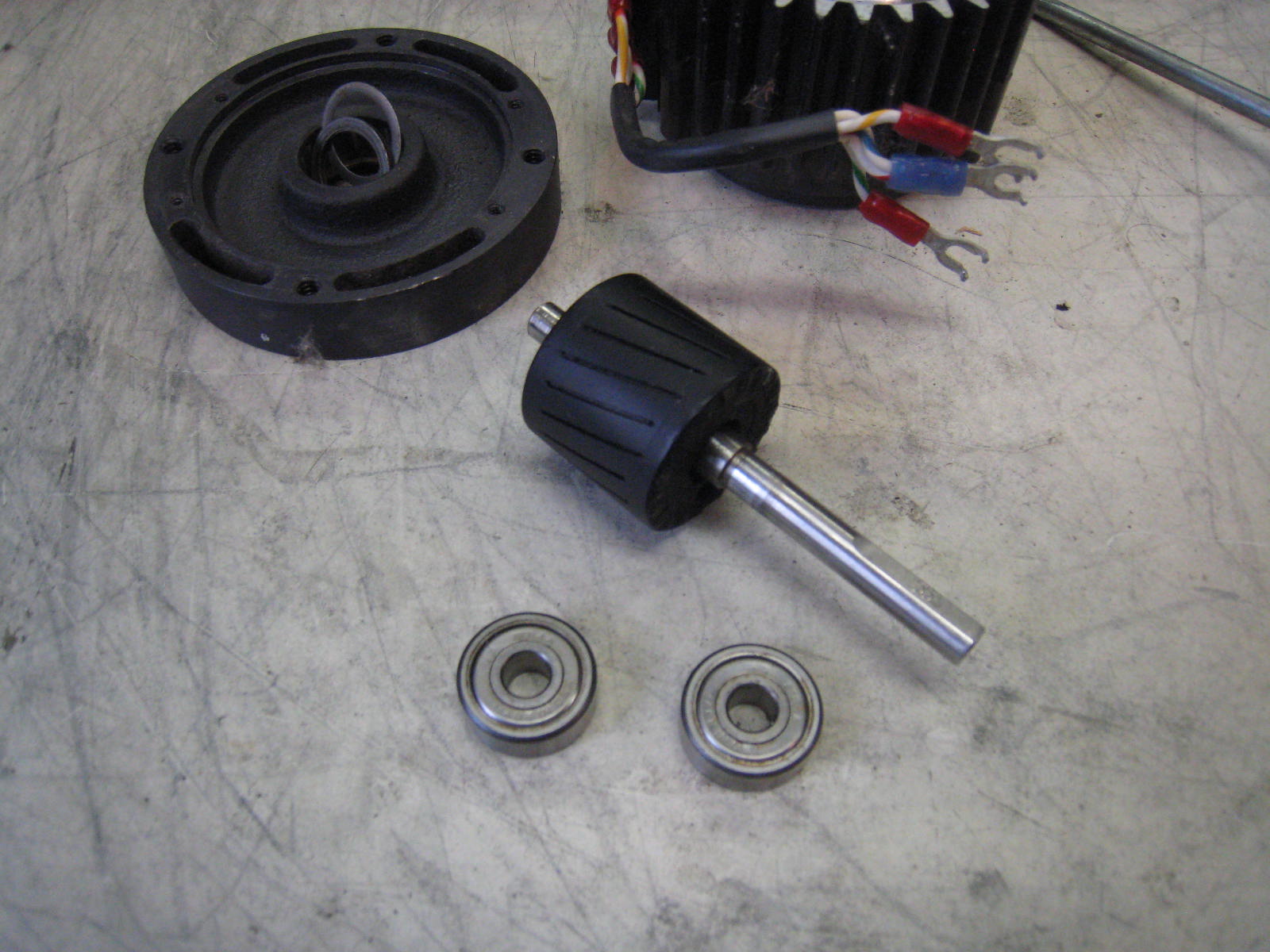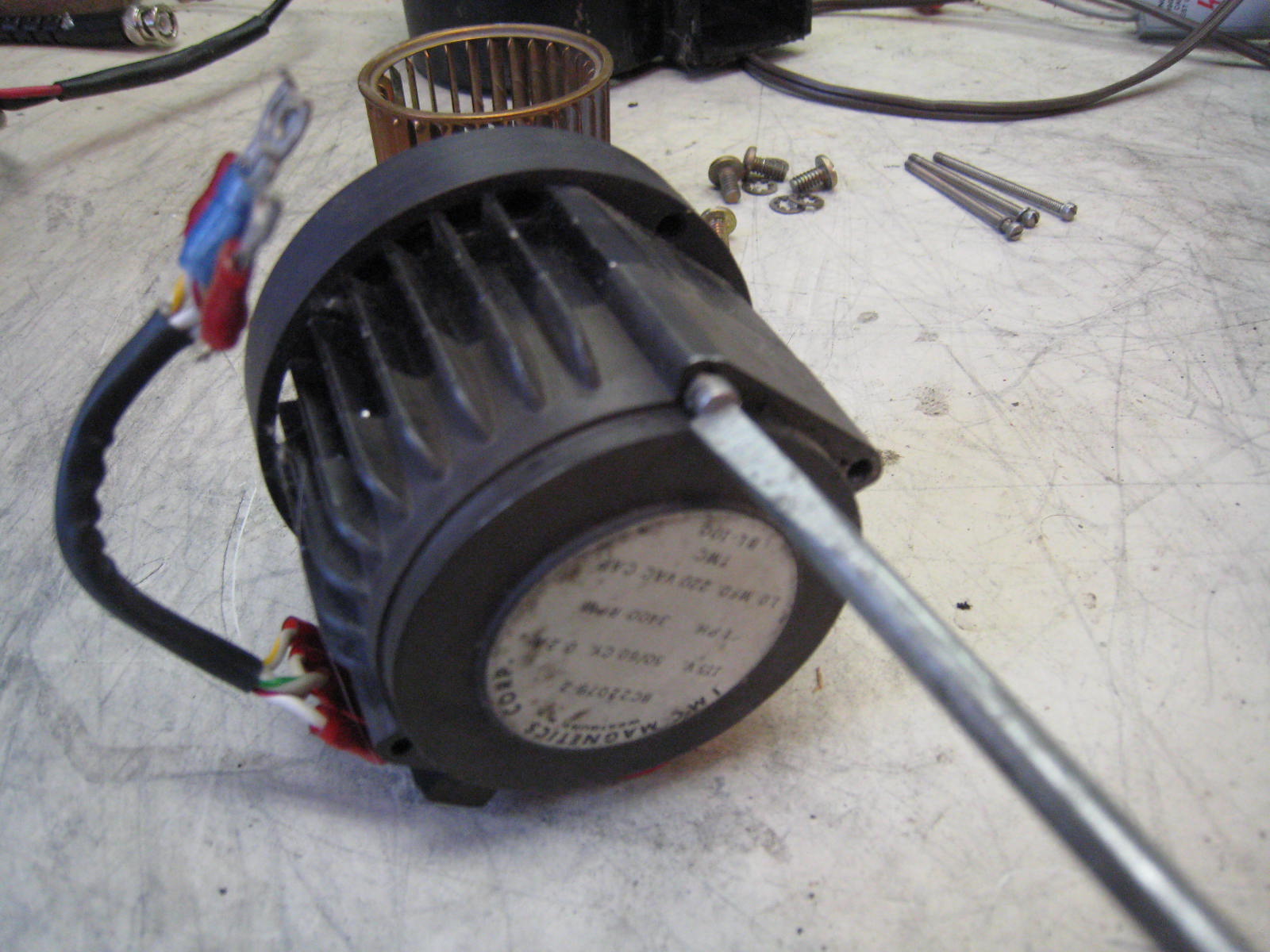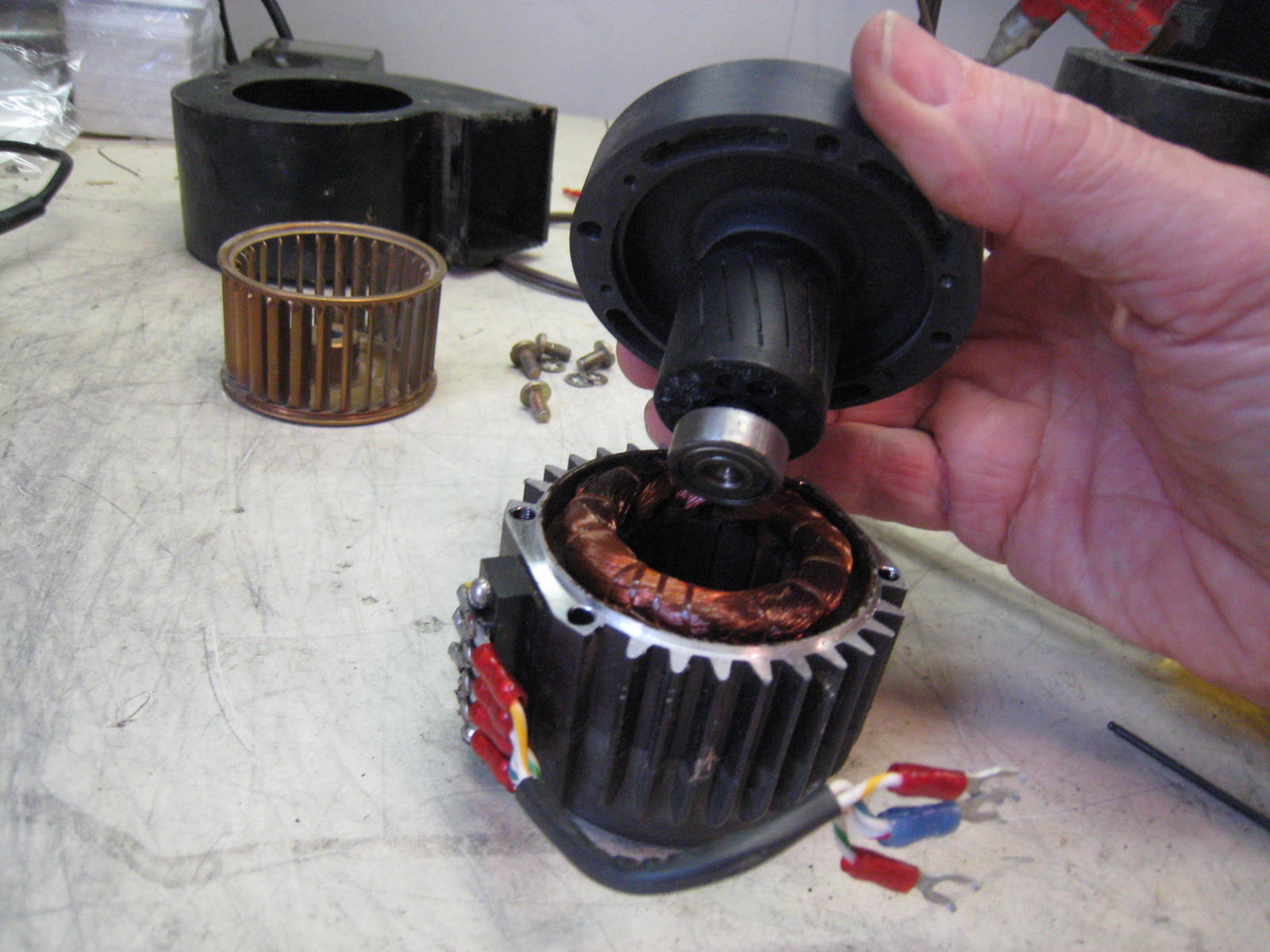 Inspection of the two amplifiers that had been in service in Canada showed that the blower rotors rotated fairly stiffly, so I elected to replace the bearings in all three fans. This turns out to be such a simple, cheap, and quick repair that you should just do it! Initial disassembly is shown in the three photos below: