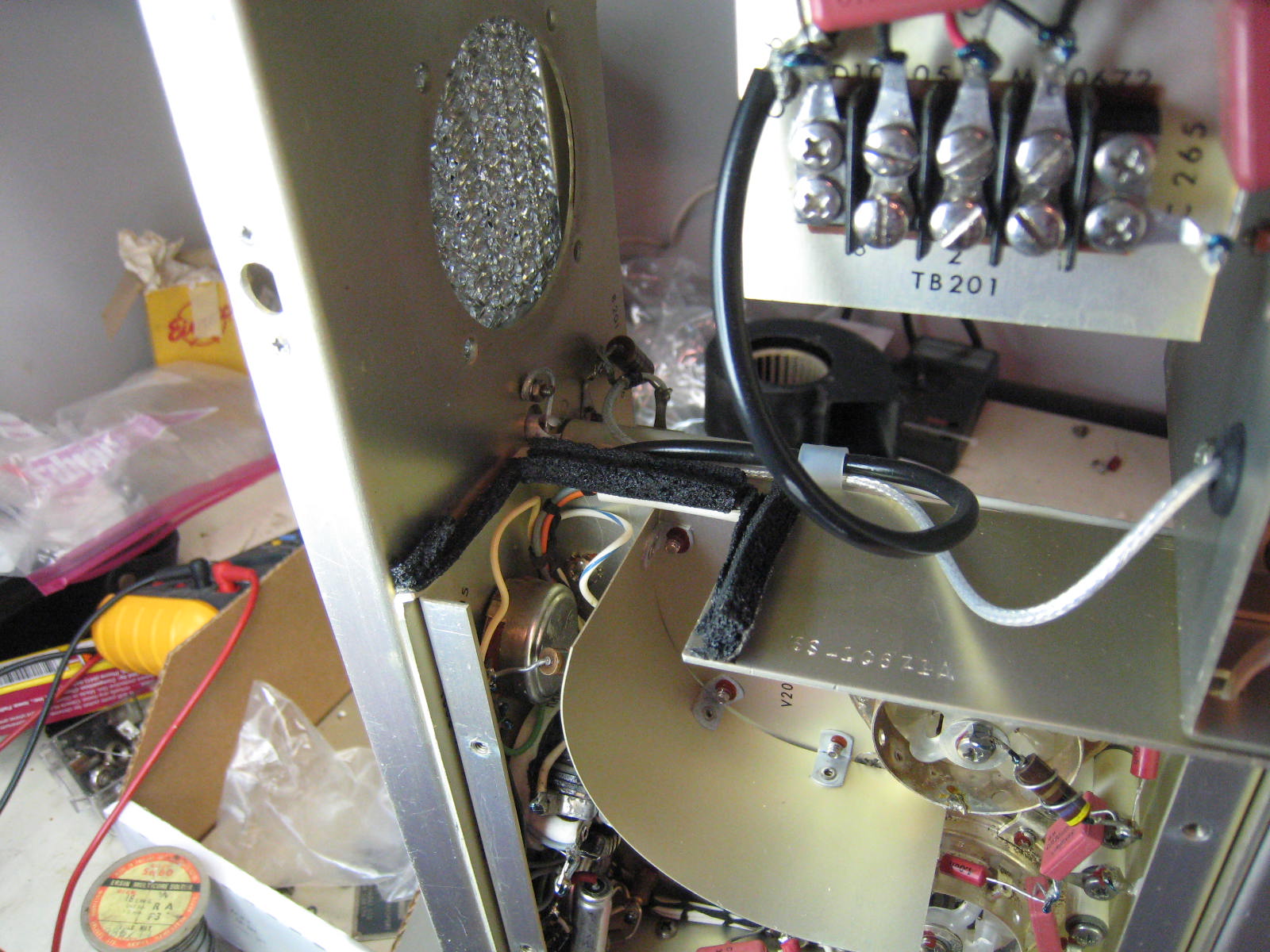 Next install the blower back into the RFE-1. Before doing that, however, you'll have to deal with the foam air seal that keep air from leaking out around the blower exhaust as it enters the bottom PA compartment, and thence up through the PA tubes.