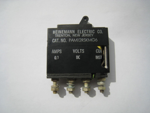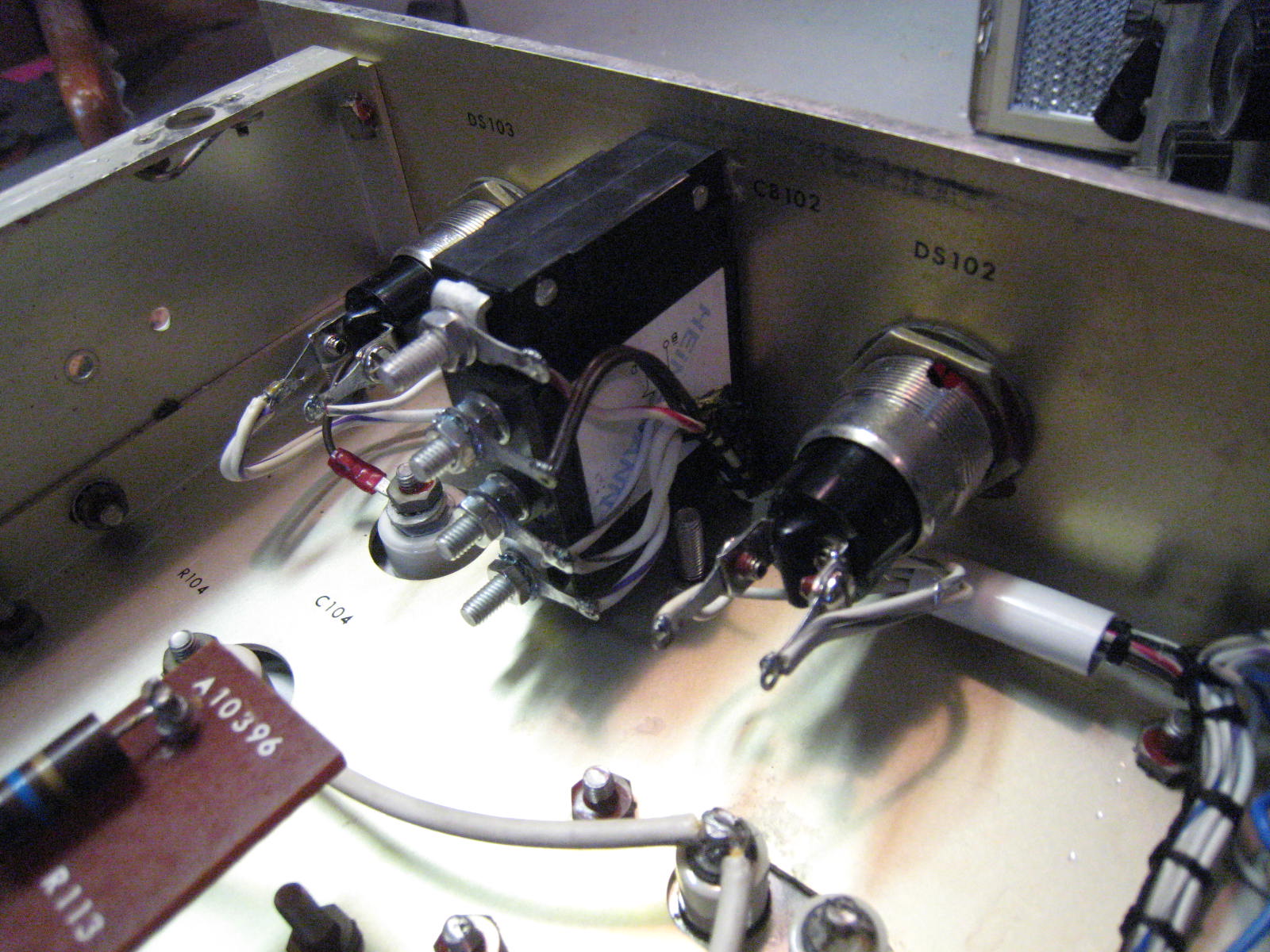 Below are pix of the two breakers. The 2-pole main AC breaker is on the left, the relay-trip plate-current-controlled single-pole breaker on the right: