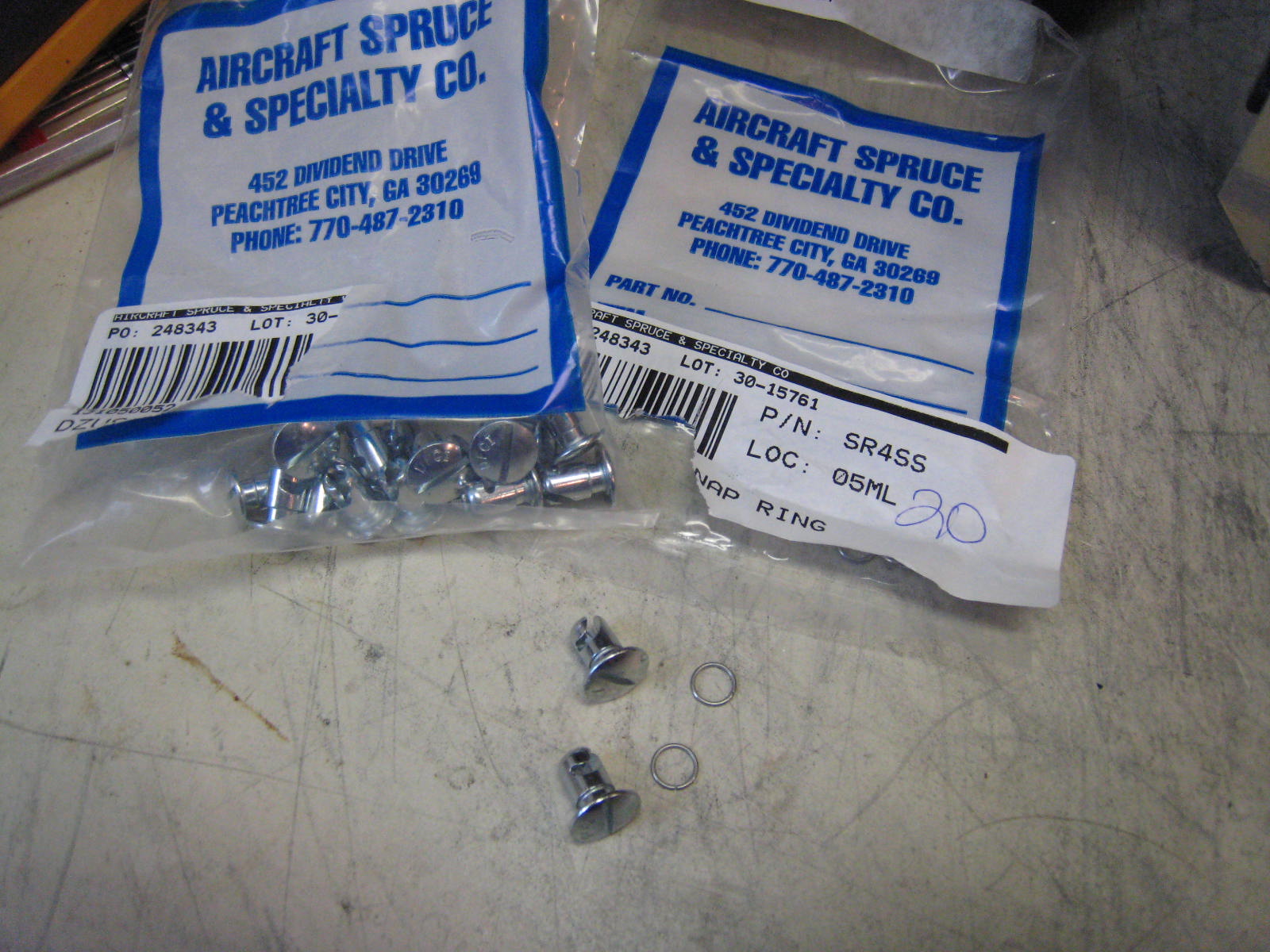 The covers for the RFE-1 and PSP-500 are secured to the chassis with Dzus fittings, those clever little 1/4-turn captive screws that are ubiquitous on Military gear. There were several of these missing from my three units, but they're easily obtainable from Aircraft Spruce (a very useful source of all kinds of odd radio parts). The parts in question are AJ4-40 Fasteners and SR4SS Snap Rings. Just poke the fastener through the hole in the cover, and push the snap ring over the bottom of the fastener.