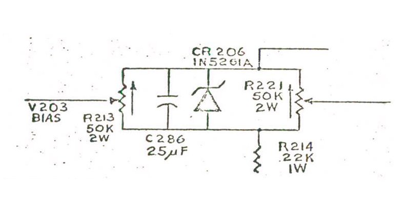 This change introduces two new parts, a zener diode (1N5261A) and a 25uF, 100V electrolytic across the two bias-adjust pots for the PA control grid bias, as shown below: