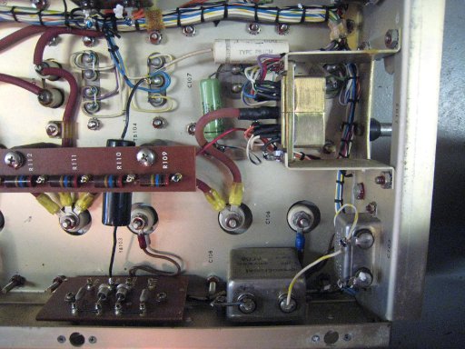 This mod was performed in different ways in the three units. In two of them, a 0.1uF 1000V Black Beauty (below the terminal board, left center in the photo) was used. In this particular unit, unlike the other two, a 2nd 0.1uF capacitor (the white unit a the upper right center of the photo) was installed. Belt and suspenders..?