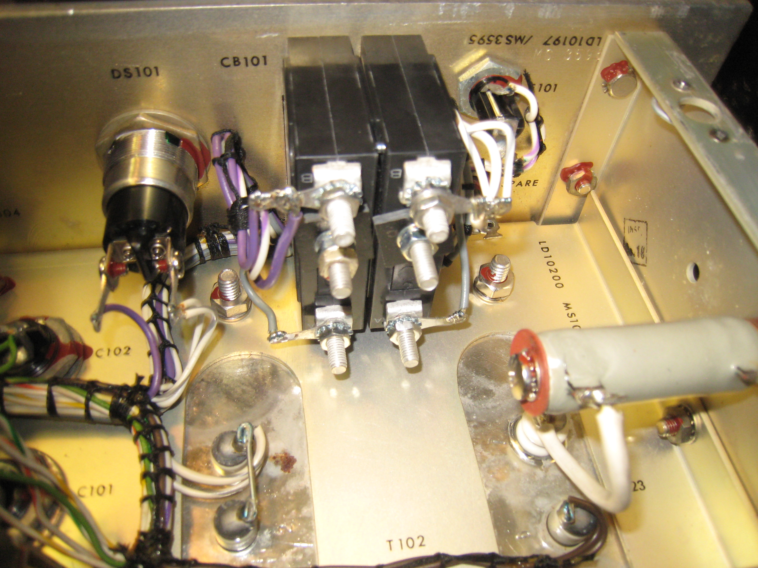 CB101 is a two-pole breaker that has an interesting feature: its series-trip solenoid is center-tapped, and there are two sets of output terminals. So, the breaker can be wired either for 15A trip (120VAC operation) or for 7.5A trip (240V operation). CB102 is even more interesting: it's a so-called "relay trip" breaker. It's contacts handle the 15A AC current for the HV power transformer, but the trip solenoid is wired to separate terminals; 100 mA of current through those terminals will trip the breaker, and these are wired to the bottom of the PA plate circuit where they sample a portion of the plate current. Current gets too big: breaker trips.