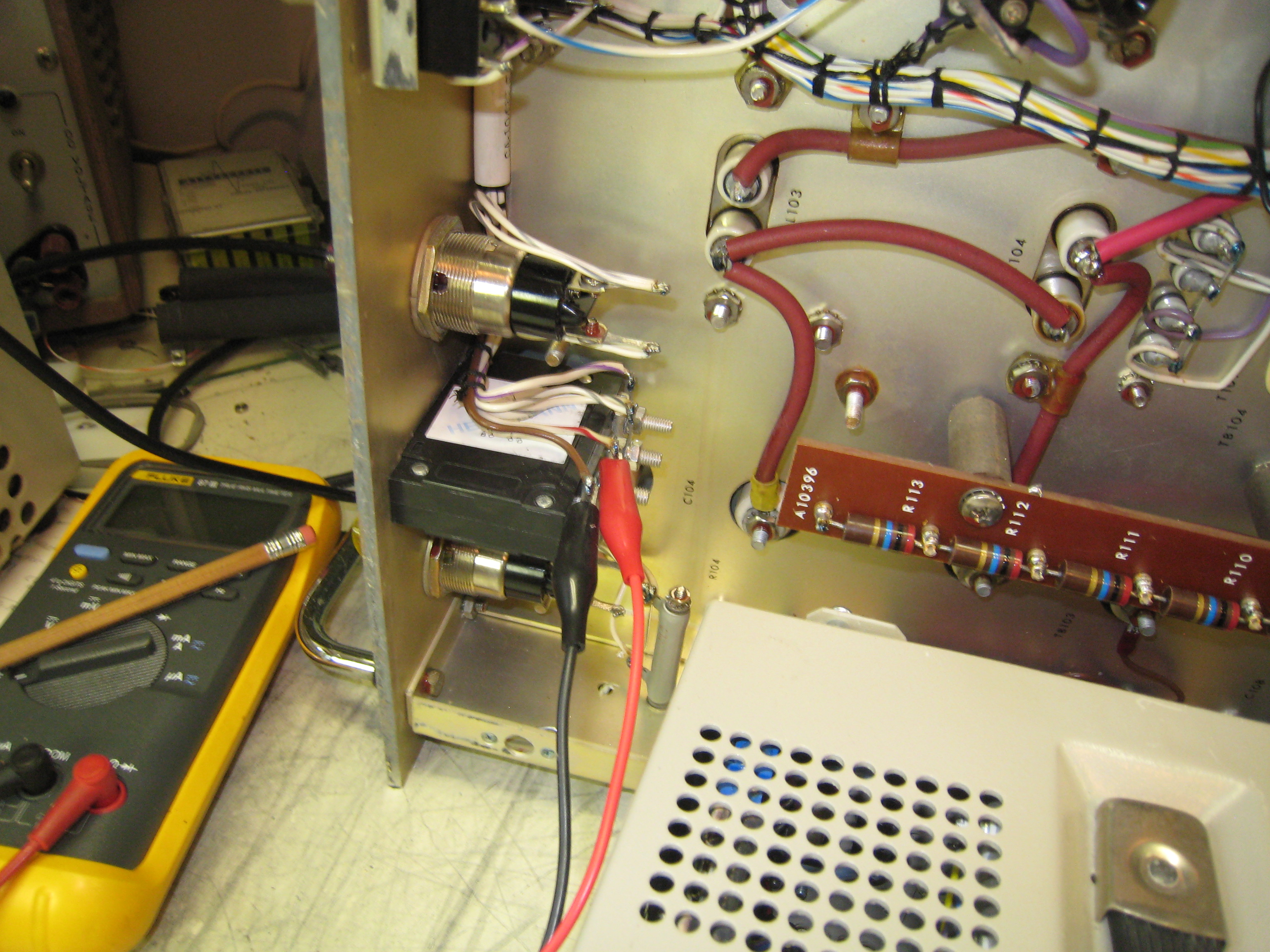 To adjust this circuit, I first disconnected the PSP-500 from AC power and from the amplifier. I then connected a bench power supply, configured in current-limiting mode, across the breaker, as shown in the photos below. To set the trip point, first adjust the current to some small value near 0, turn the overload breaker ON, then slowly advance the current setting until the breaker trips. Turn R116 CW until the overload current is about 400 mA. This is well below the maximum Ip for two 4CX350A's, and well above the current at which you'll want to operate your amp.