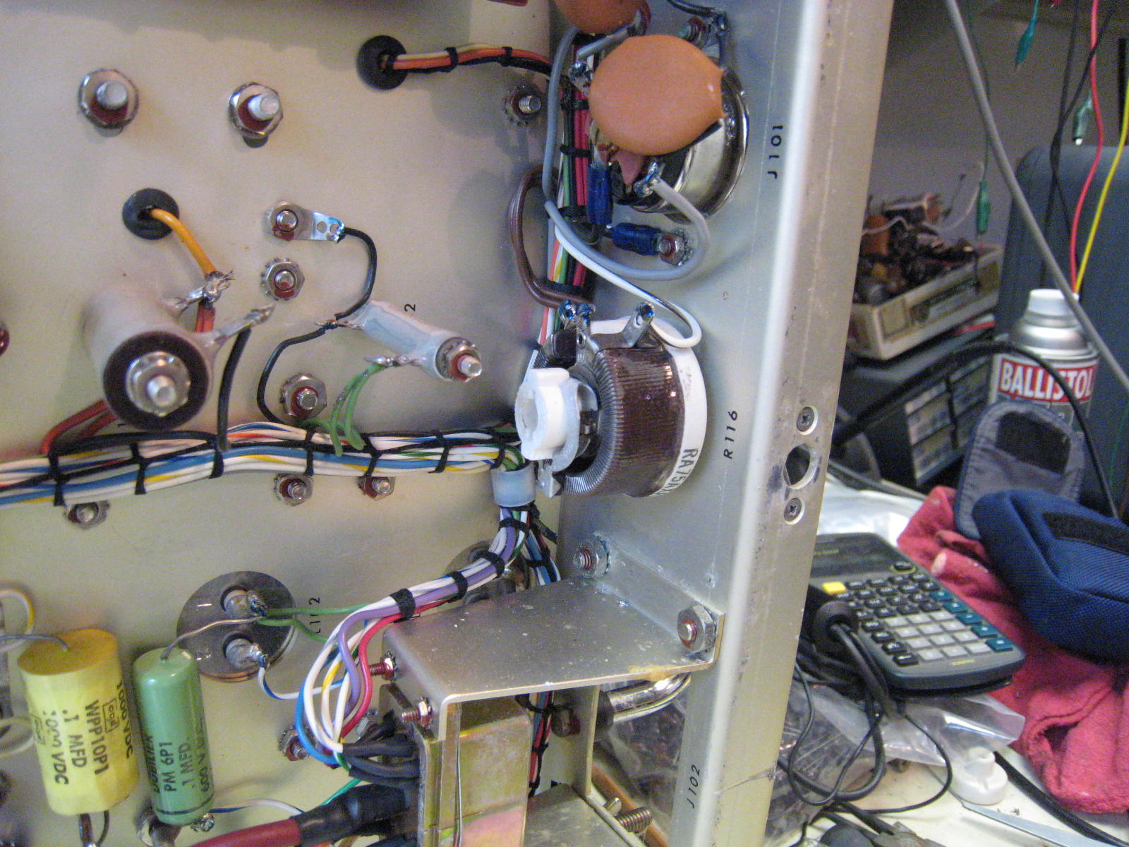 Once I got into thinking about the circuit, I realized that TMC had undersized the power specification for this resistor. The stock resistor is a 50W unit, and this is fine provided the amplifier is in operation. The problem comes about when the amplifier is off, but the plate voltage is turned on, as in CW mode. Here, the plate voltage rises to about 3000V, and the dropping resistor drops 3000-370 = 2630V. V2/R = 86W, which considerably exceeds the stock resistor's 50W rating. I found some 80K 100W resistors on the usual auction place and bought a bunch of them. They're larger than stock, but you can mount them by flipping the two mounting brackets around, and cutting a 7-1/2" long piece of 8-32 threaded rod to hold the resistor in place. You'll need to find some thin ceramic insulators for each end of the resistor, to keep the resistor terminals safely away from the metal bracket--I had some in my junk box, and will look for them online. Finally, be sure to install a fiber washer between the ceramic insulator and the bracket, to keep the ceramic from getting cracked. The photo below shows this installation.