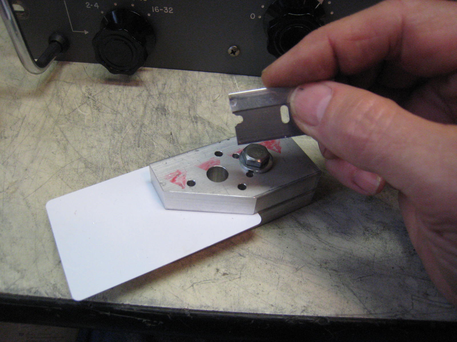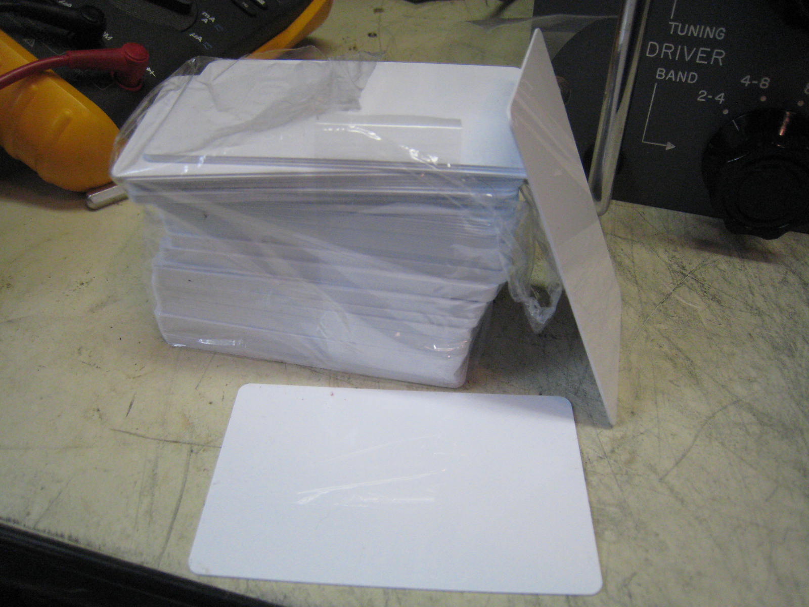 The material that the pointers are made from is 1/32" thick PVC, and it turns out to be exactly the material that's used to make credit cards and ID badges. I found a bunch of this card stock for sale on EBAY, and obtained several life-times' supply for $10 or so. I freely admit being a complete nut about doing stuff like this. I obsessed about the best way to make these things for a while, then decided to fabricate a little jig to make them. See below for how the process works:
