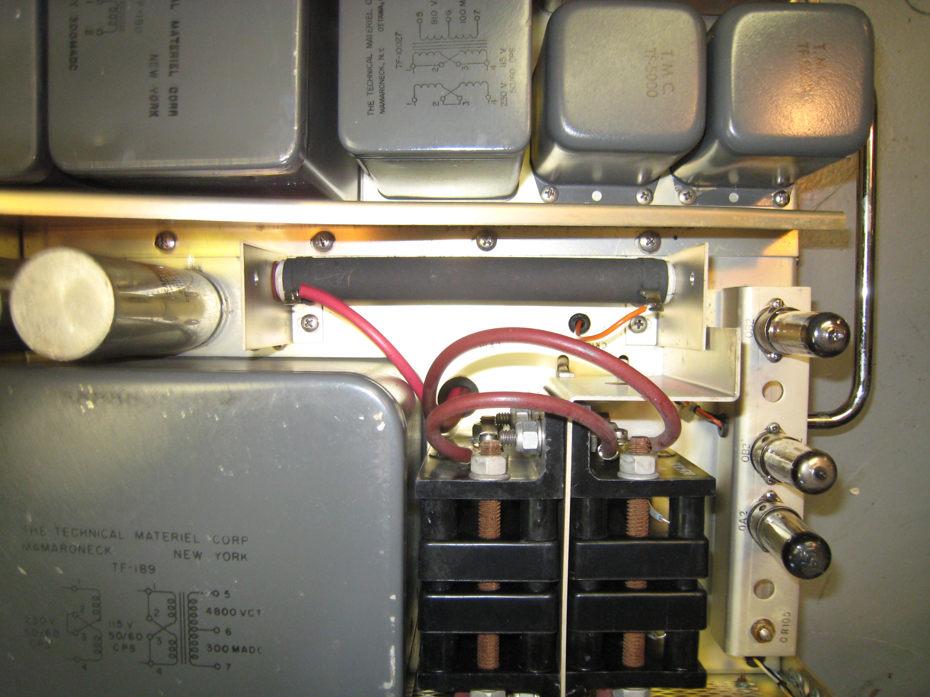 At the suggestion of Larry Godek, I checked the filament voltage on RFE-1 s/n 148. Eimac states that the filament voltage for the 4CXxx tubes needs to be controlled carefully, and they call for a voltage of 6.0VAC +/- 5%. The voltage is monitored on the multi-meter, and the circuit that rectifies the voltage consists of a 1N67 diode and an 82K ohm, 1W, 5% resistor, both located in the bottom PA compartment.